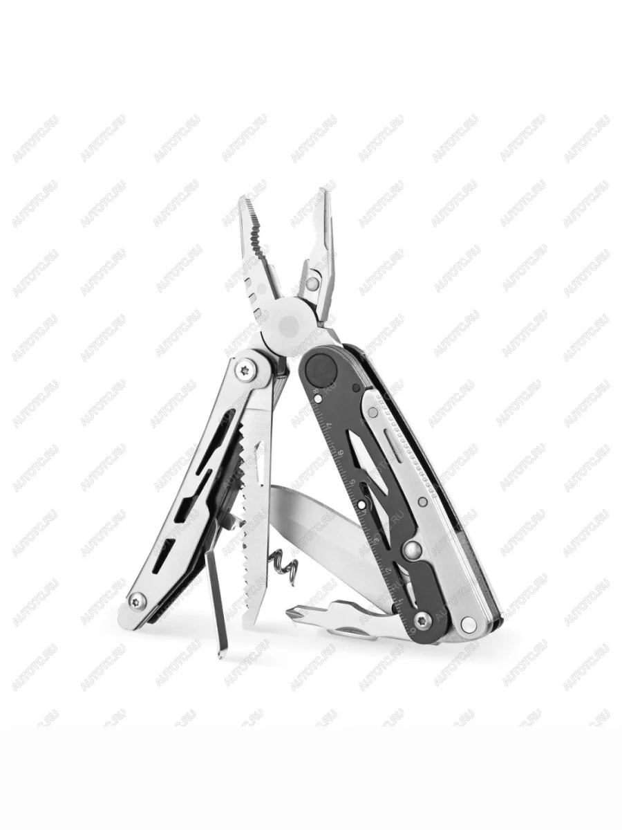 Универсальный мультитул пригодится в туристическом походе, в экстренной ситуации, для ремонта или для решения бытовых и рабочих вопросов. Без коробки инструмент весит 323 грамма. Инструменты изготовлены из нержавеющей стали. Мультитул открывается с помощью замка Button Lock.